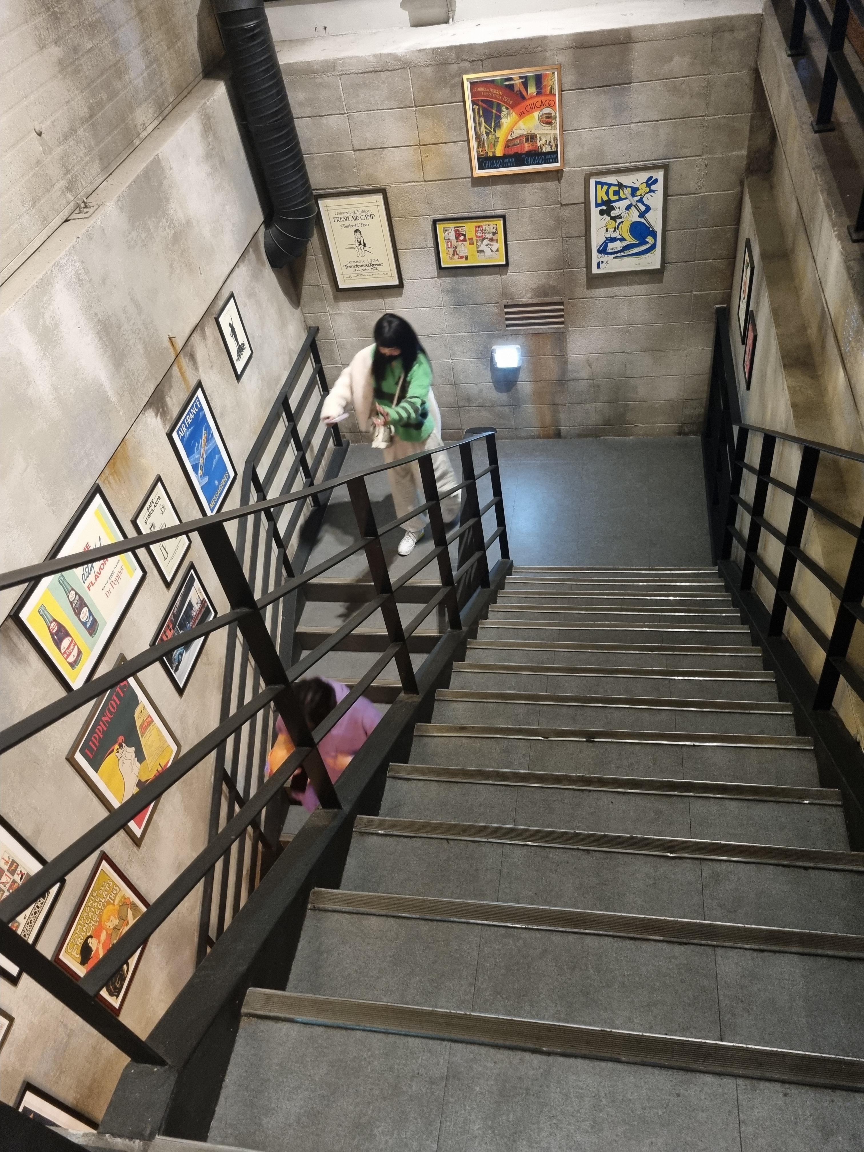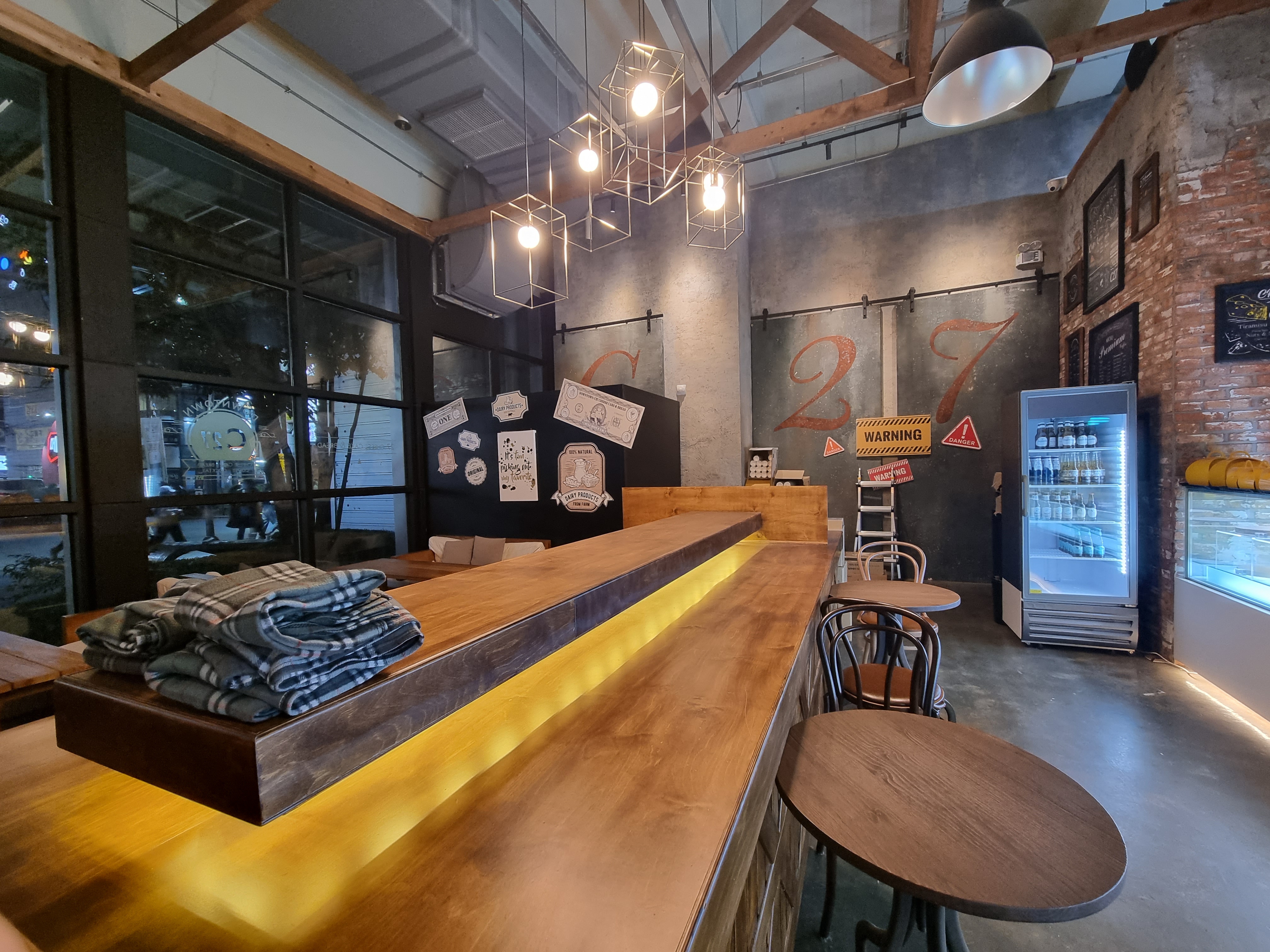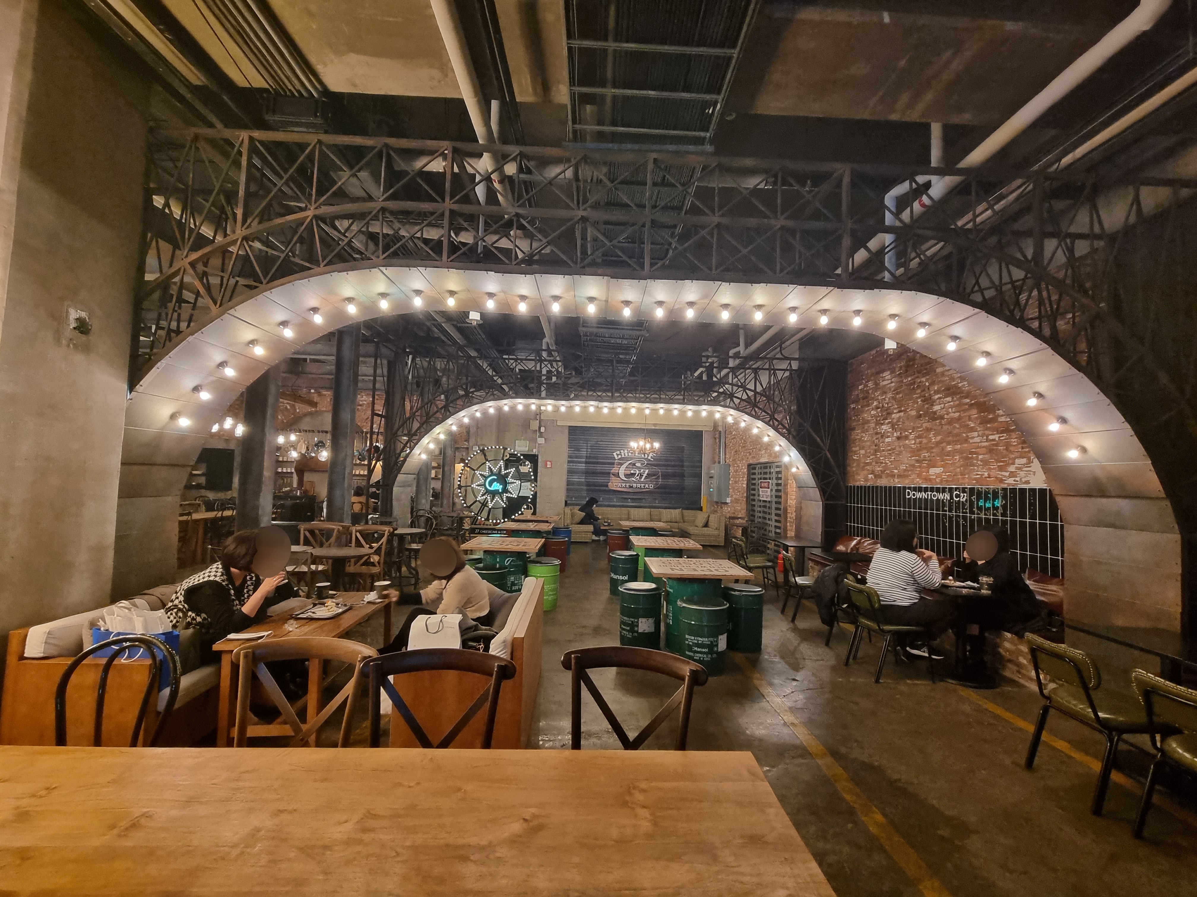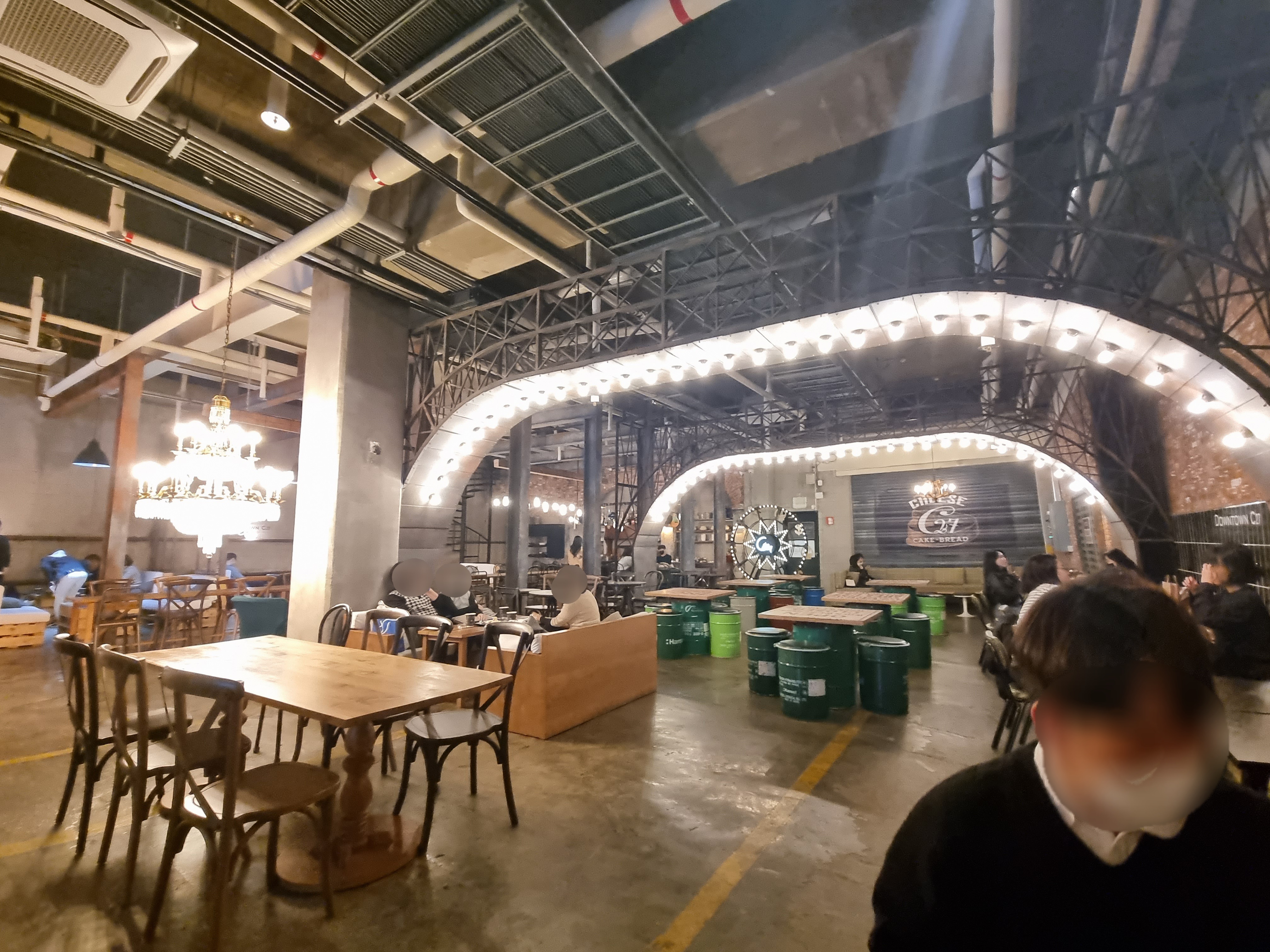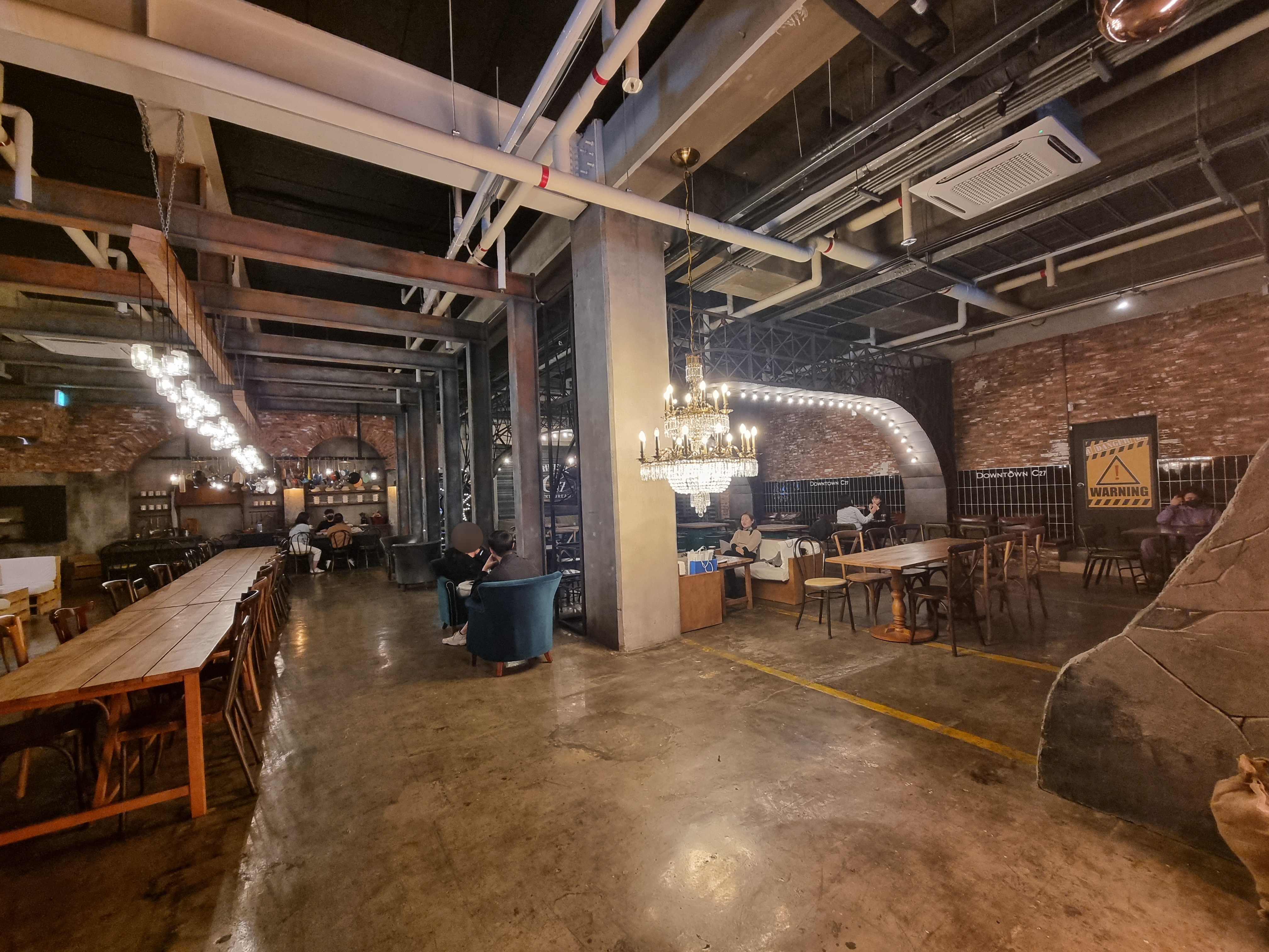 파이프와 원목 테이블, 샹들리에 등 중구난방의 인테리어들의 향연..